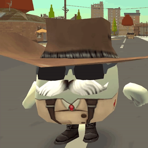 A Chicken Gun character, an egg-like figure, wearing a cowboy hat, sunglasses, and a mustache, standing on a road.
