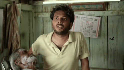 A scene from Cinema Bandi Telugu, featuring a man in a yellow shirt looking sad while an older man is being shaved.