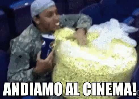 A man in a military uniform devours a massive bag of popcorn and a drink at the cinema.