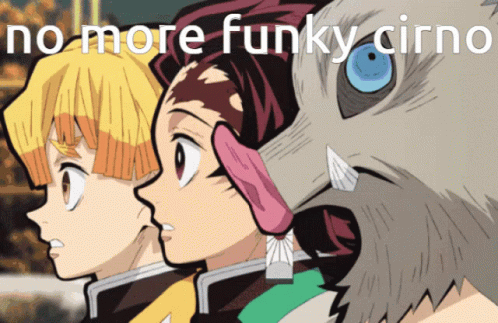 Tanjiro, Zenitsu, and Inosuke from Demon Slayer react to 'no more funky Cirno' meme, referencing Cirno Fumo.