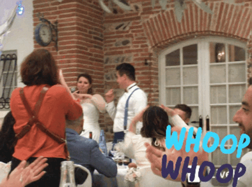 Sophie, the bride, and Team Ciseaux celebrate at a wedding reception with "WHOOP WHOOP" energy.