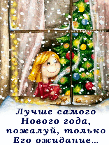A charming illustration of a girl looking out a snowy window, anticipating the New Year with a cozy drink.