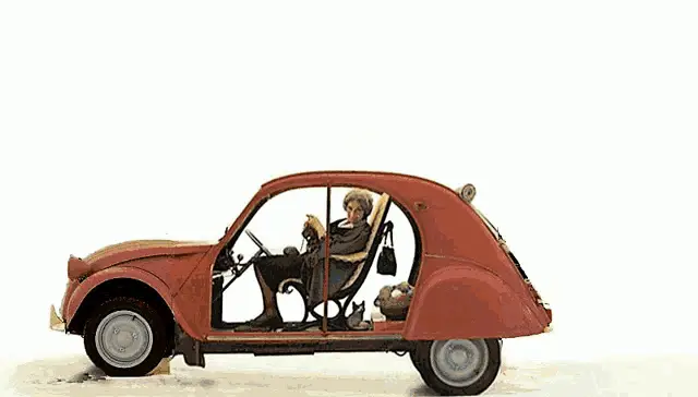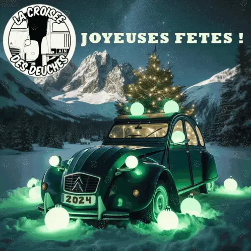 A classic white Citroen 2CV car decorated for 'French Days' with flags and cargo.