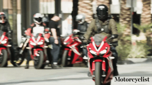 A group of motorcyclists on red Honda CBR bikes are geared up and lined up on a city street, ready to ride.