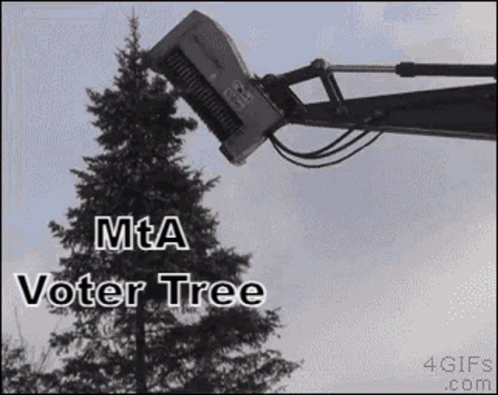 Heavy machinery rapidly shreds a tree with 'MtA Voter Tree' text visible on screen.