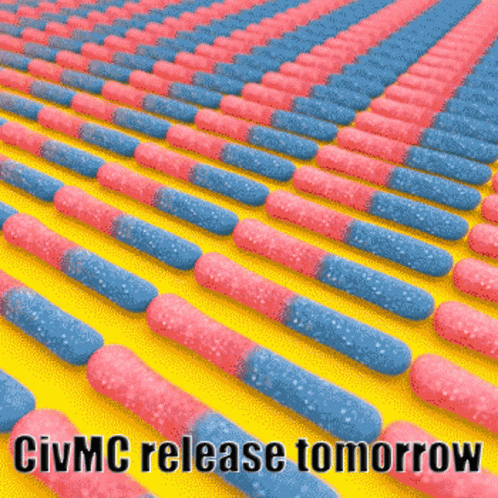 Rows of pink and blue candy-like objects on a yellow background, announcing 'CivMC release tomorrow'.