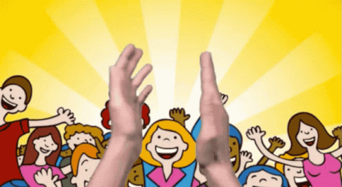 Animated crowd cheers as hands clap in celebration against a bright yellow background with sun rays.