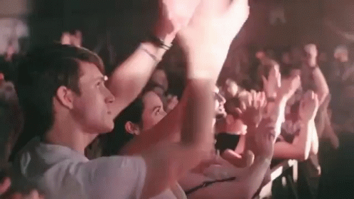 Enthusiastic crowd clapping and cheering at a lively concert, possibly a Chromeo performance.
