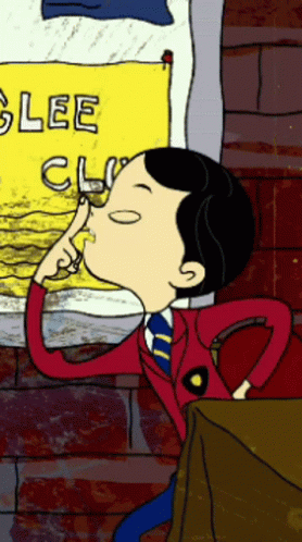 Kam from Class of 3000 picking his nose in a silly moment, with a 'Glee Club' sign in the background.