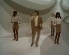 Claude François dancing with backup dancers in a retro studio setting.
