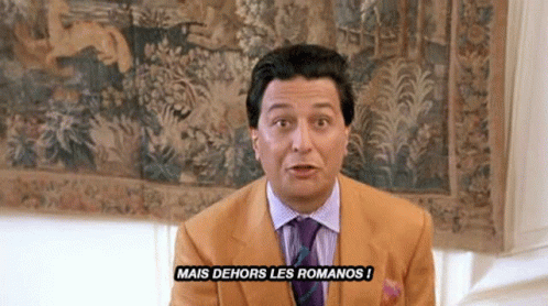 Christian Clavier, dressed in a suit, exclaims 'Mais dehors les Romanos!' in front of a tapestry.