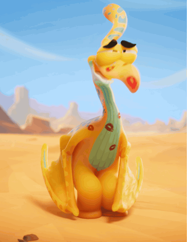 a cartoon character with a long neck is sitting in the sand
