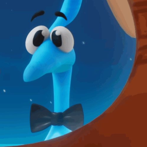 a blue cartoon character wearing a bow tie looks out of a window