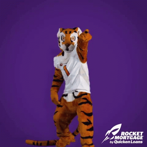 Clemson Tigers mascot in a white jersey with number 1, dancing energetically against a purple background.