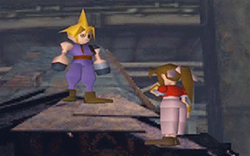 Cloud Strife and Aerith Gainsborough from Final Fantasy VII stand together in a classic low-polygon scene.