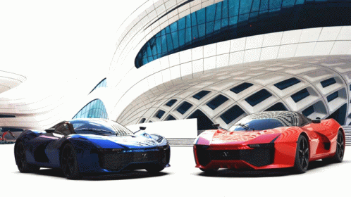Two Clg Calegari Brazilian sports cars, one red and one blue, parked in front of a modern building.