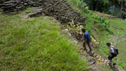 Two explorers ascend ancient ruins amidst lush jungle, featuring the National Geographic logo.