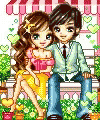 A pixel art couple, a man and a woman, sitting on a bench surrounded by hearts and plants in a charming scene.