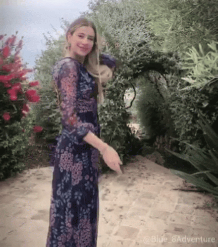 Clizia Incorvaia blows a sweet flying kiss to the camera, looking beautiful in a floral dress in a lush garden.