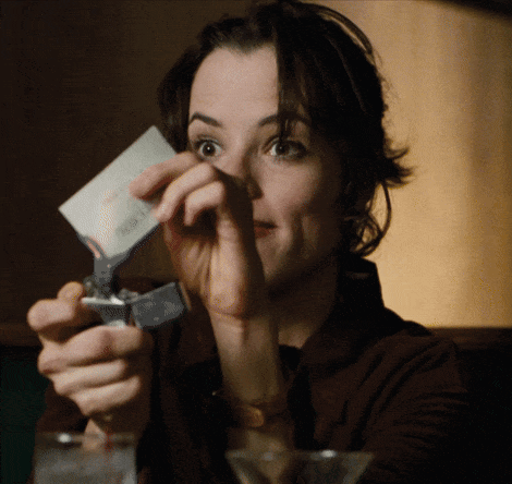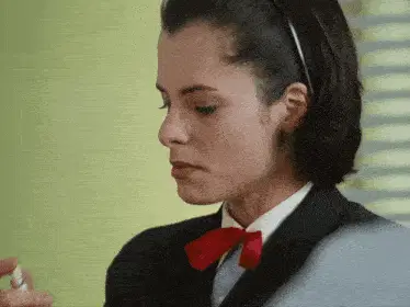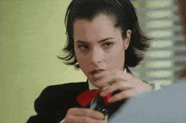 Parker Posey as Margaret in Clockwatchers, holding a piece of paper with an 'I'm sorry' message.