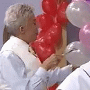 Clodovil holding red and pink balloons at the Clodovilfesta event, wearing a light shirt and tie.