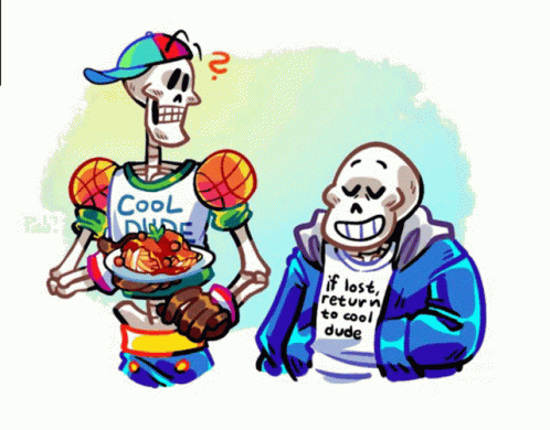 Undertale's Sans and Papyrus wear matching shirts with humorous messages, evolving through different outfits.