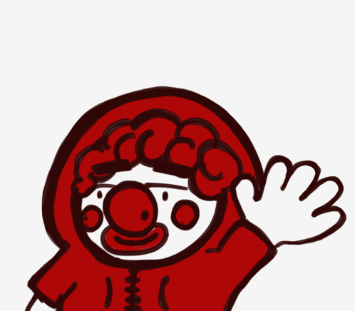 A cheerful cartoon clown from Circo with red curly hair and a red nose waves hello while wearing a red hoodie.