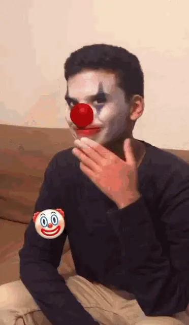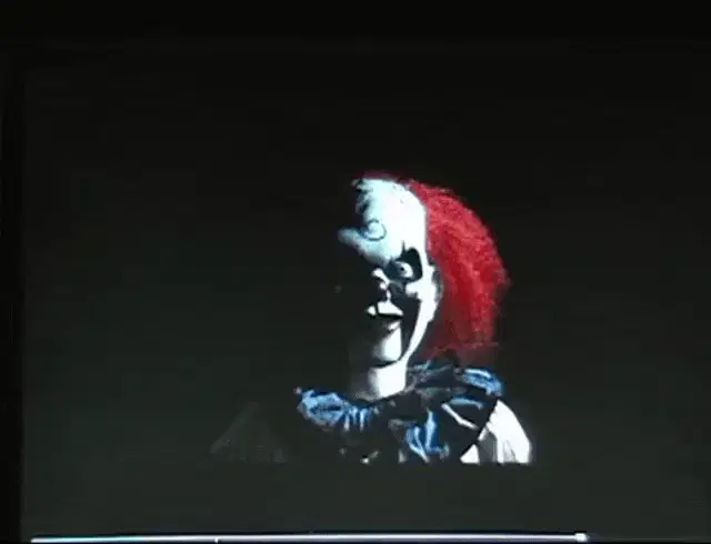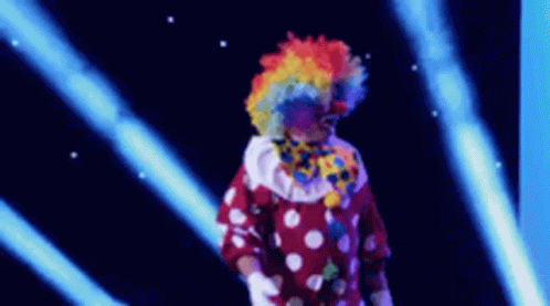 A colorful clown performs on stage, joined by other performers under bright blue stage lights.