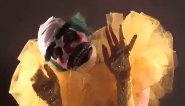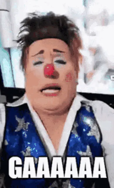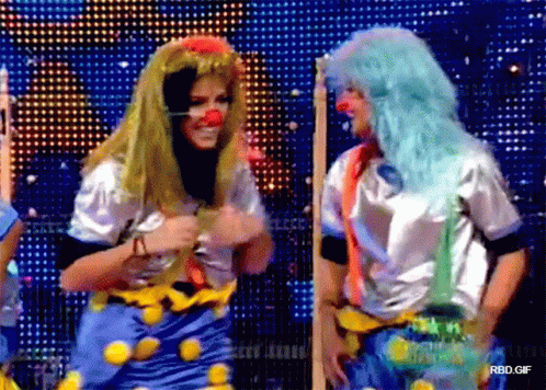 Dulce Maria and Maite Perroni perform as clowns, smiling and dancing on stage in colorful costumes.