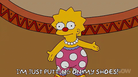 Lisa Simpson, dressed as a clown, exclaims 'I'M JUST PUTTING ON MY SHOES!' while wearing oversized footwear.