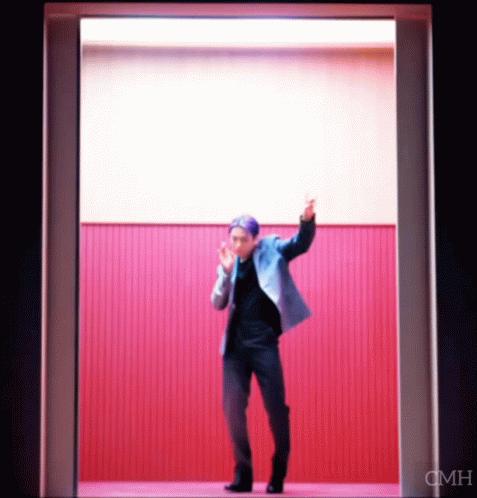 A man in a suit performs a dance, tagged with BTS members J-Hope, Jimin, Jin, JK, RM, Suga, and Taehyung.