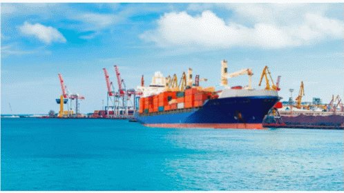 Explore CMMC and cybersecurity consulting services for global supply chain management, featuring container ships and digital security.