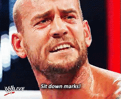 CM Punk, the WWE superstar, intensely yells 'Sit down marks!' during a live wrestling event.