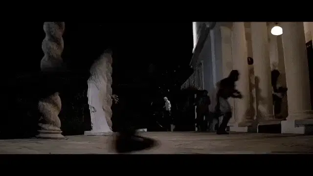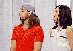 A man makes a dramatic gesture towards a woman, leading to her exaggerated and comical collapse.