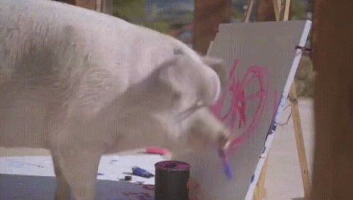 A talented pig creates abstract art, painting a heart with pink paint on a white canvas.