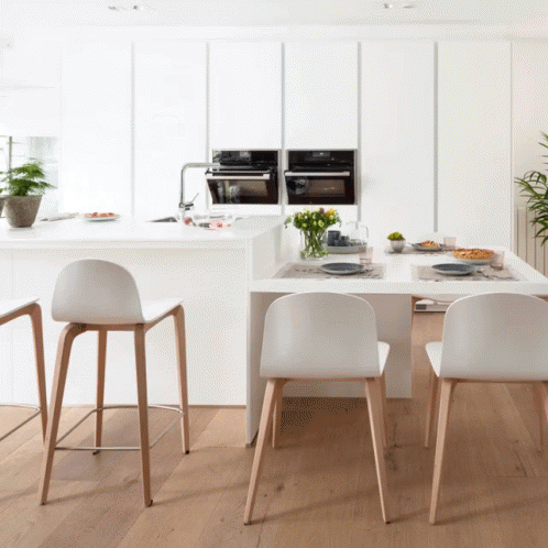 A modern white kitchen features sleek, hidden storage cabinets and integrated appliances that open and close.