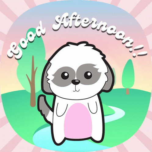 Cocoandherplato Ponkan, a cute cartoon dog, winks with 'Good Afternoon!!' text in a park setting.