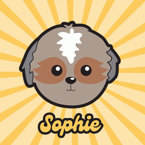 A cute cartoon drawing of a dog with a white and brown face, named Sophie, set against a yellow background.