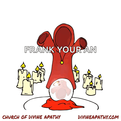 Advertisement for the Church of Divine Apathy, featuring a cultist figure and candles, promoting enormous indifference.
