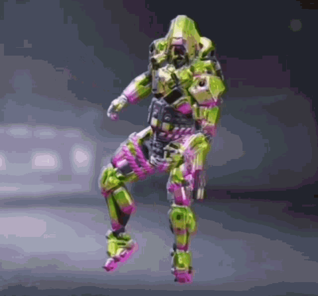 A robot character from Call of Duty Mobile performs a vibrant dance emote, showcasing its neon green and pink outfit.