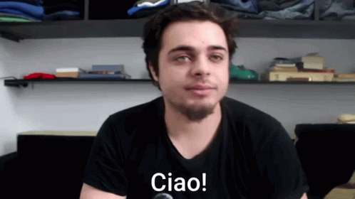 Codrin Bradea greets viewers with a friendly 'Ciao!' while holding an object, in front of a bookshelf.