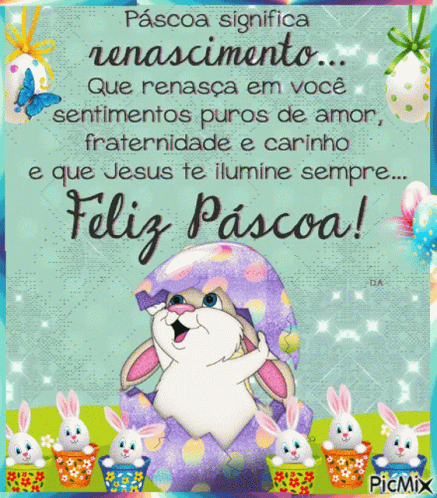 A cheerful Easter greeting featuring a cute bunny emerging from a purple egg, surrounded by smaller bunnies and a message of rebirth, love, and fraternity.