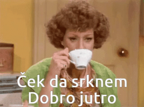 A woman with curly hair sips coffee from a cup, accompanied by a 'Good morning' message in Serbian.