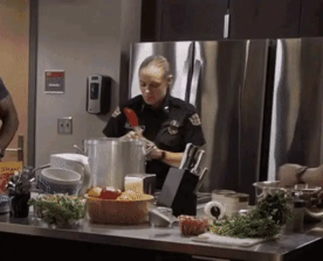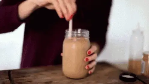 A red mug with a smiling face and arms stirs coffee with a spoon and adds a marshmallow.