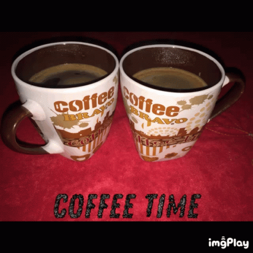 Enjoy a moment with two steaming cups of coffee, featuring 'Coffee Bravo' mugs and a heart-shaped foam.