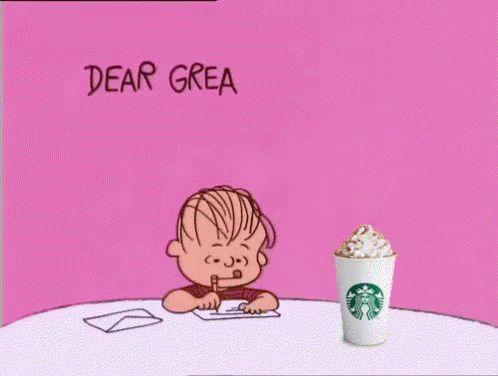 Linus writes a heartfelt letter to the Great Pumpkin, accompanied by a Starbucks Pumpkin Spice Latte.