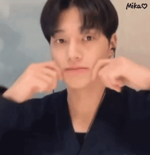 ATEEZ's Wooyoung makes funny faces, squishing his cheeks and showing his adorable bread smile.