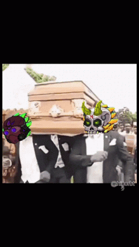 Animated Skullbots characters participate in the Coffin Dance meme, carrying a coffin in tuxedos.