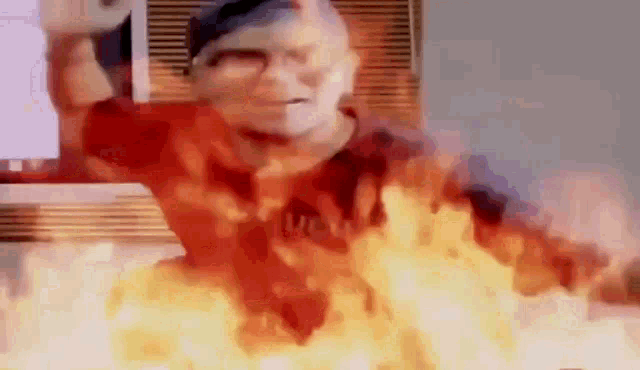 Coki Pardede from Majelis Lucu reacting and dancing while engulfed in flames.