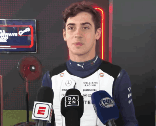 Franco Colapinto in a Williams Racing shirt, giving an interview and playfully sticking out his tongue.